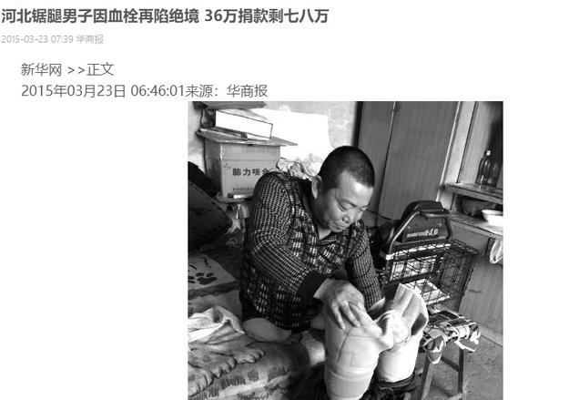 华商报2015年3月23日《河北锯腿男子因血栓再陷绝境 36万捐款剩七八万》的报道