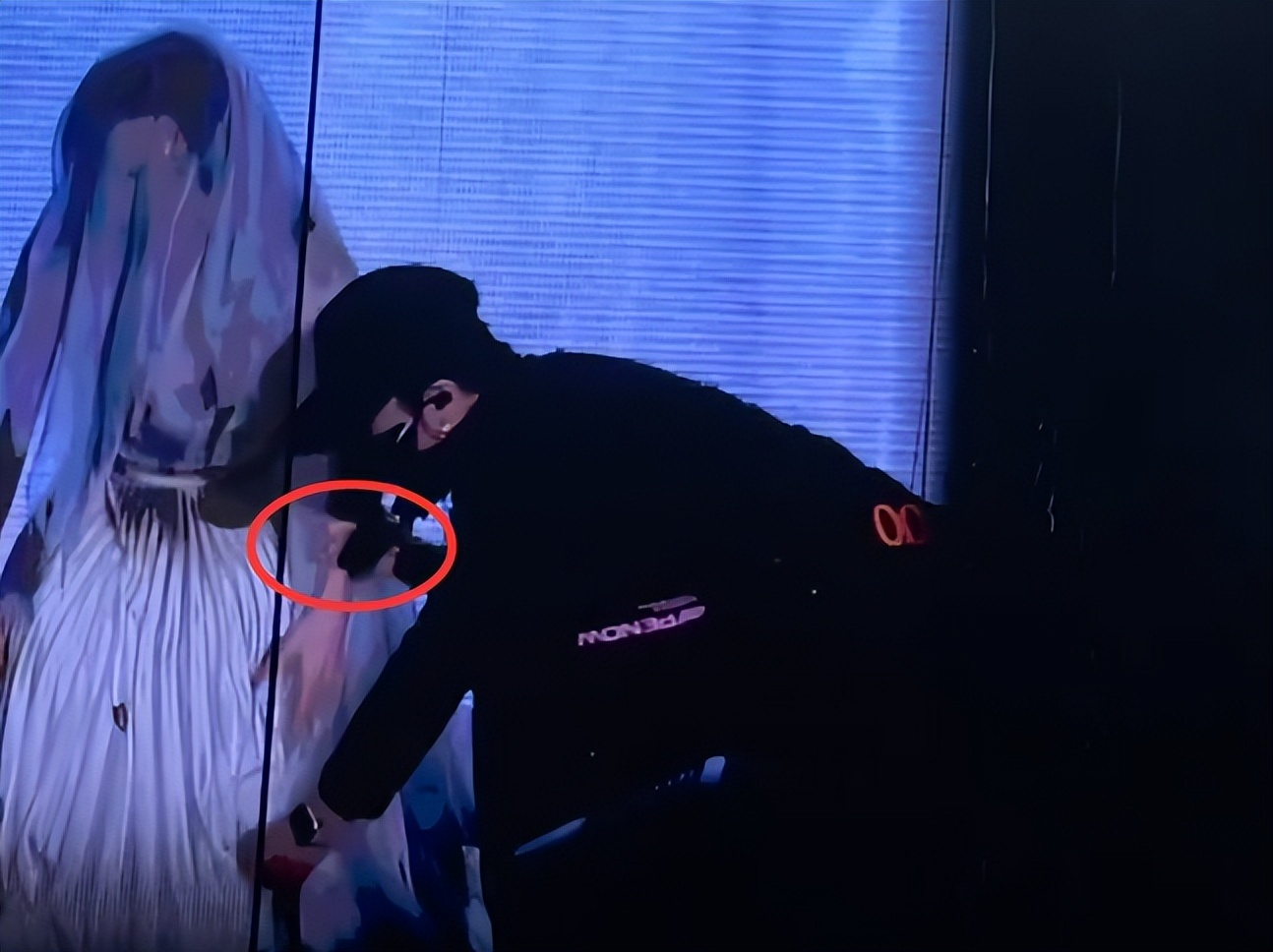 眼见邓紫棋站不起来,台下穿黑衣服的工作人员迅速登台,帮她撩起了裙摆,邓紫棋才成功站了起来。