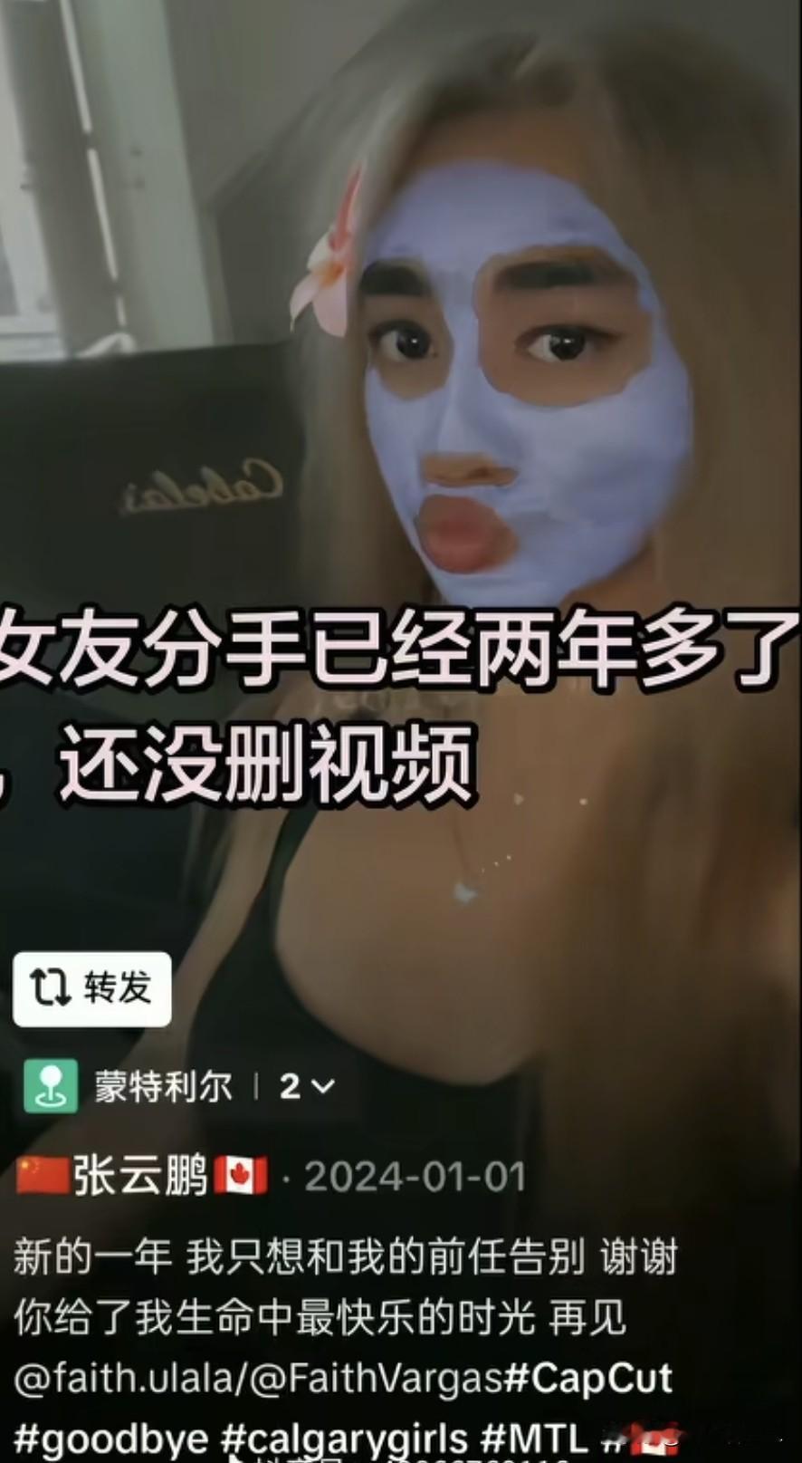 而在他的个人账号中发现,他在2024年和前女友分手,那是一个外国女孩,可能出于对女孩的保护,特意发了一张带着面膜的照片。