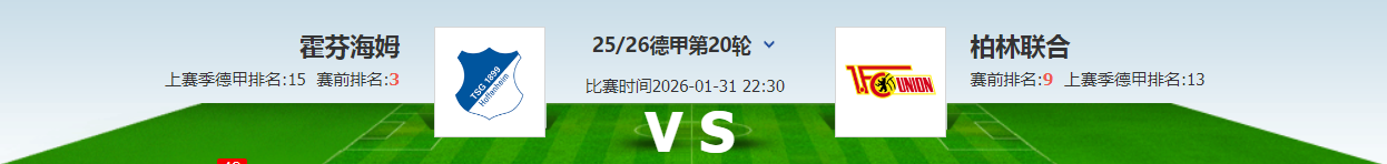 德甲第20轮全面展开,本场比赛由主场的霍芬海姆迎战柏林联合。霍芬海姆目前取得了12胜3平4负的成绩,积39分排在积分榜第三位;柏林联合目前取得了6胜6平7负的成绩,积24分排在积分榜第9位。