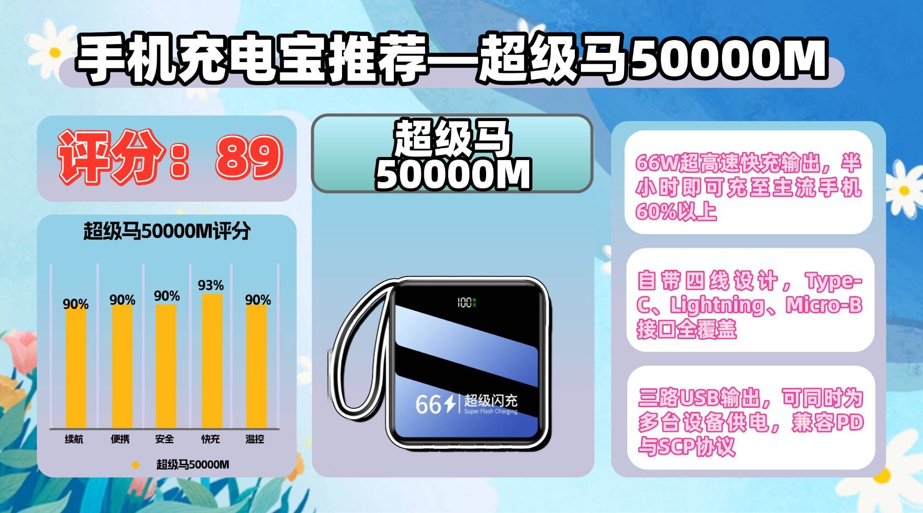 超级马50000M拥有20000mAh大容量,实际测试可在30分钟内给大部分手机充到60%以上,非常适合长途出行或多设备充电需求。支持66W快充,同时自带Type-C、Lightning、Micro-B和A口数据线,三接口设计便捷,兼容性较好。