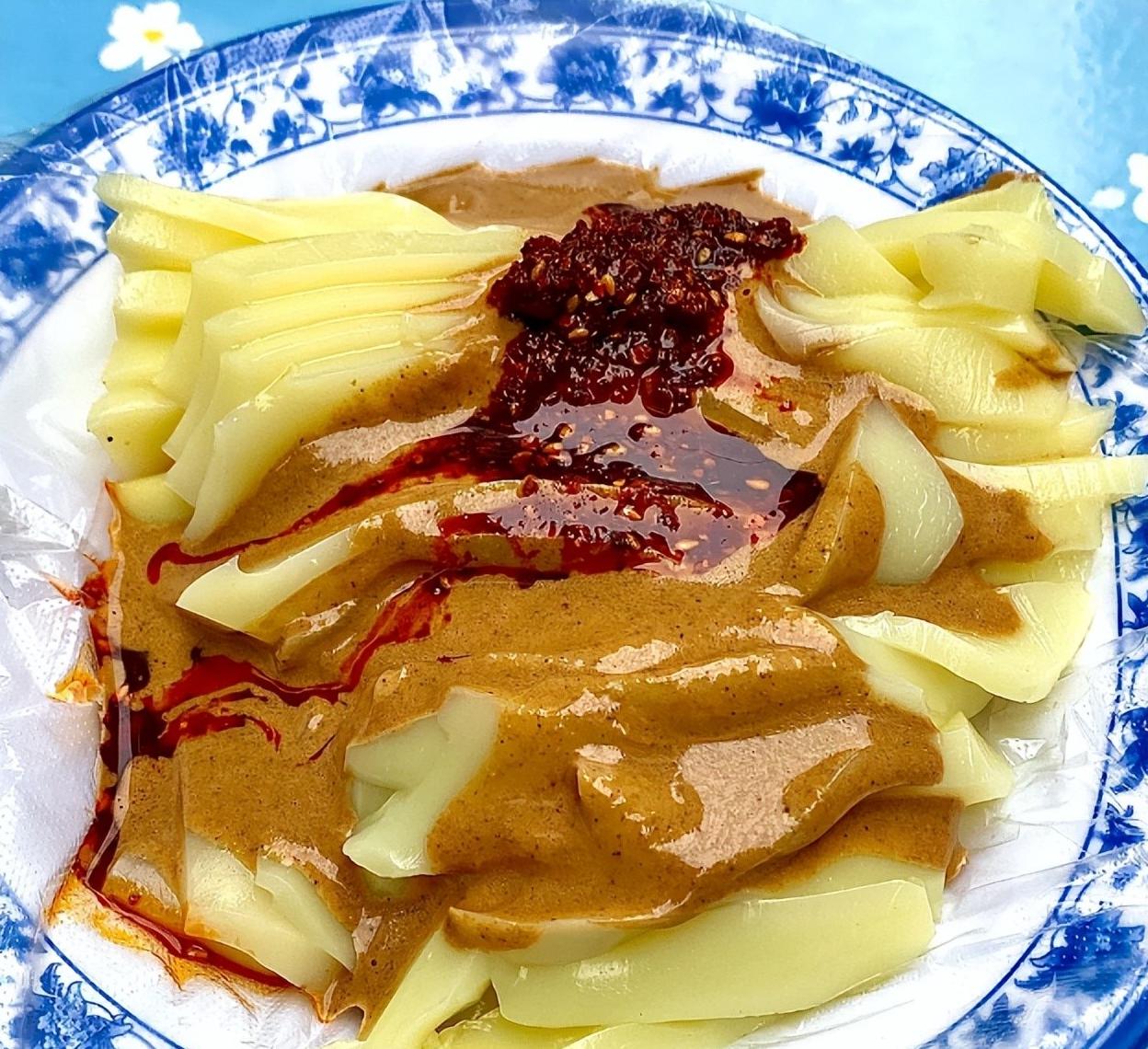 店里的师傅熟练地切凉粉,再淋上芝麻酱与辣椒油,那浓烈的香气扑面而来,显示出凉粉的独特风味。