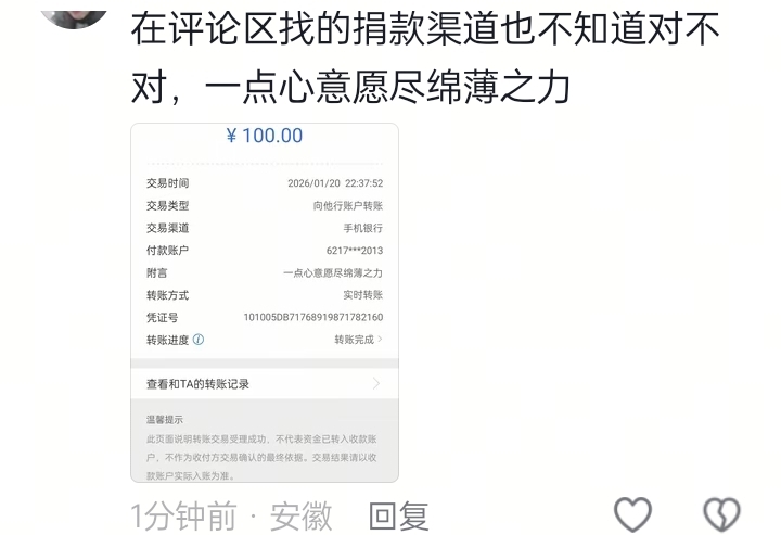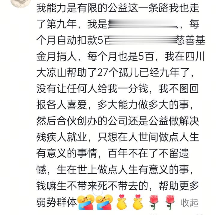 网友们对此纷纷响应。有人正愁没渠道捐钱,刷到视频就献出爱心;还有像伊辰这样的公益达人,做公益九年,既是嫣然基金月捐人,也是韩红慈善基金月捐人,每月各捐500元,还在四川大凉山帮扶27个孤儿九年,不仅如此,他还合伙创办公益公司解决残疾人就业。