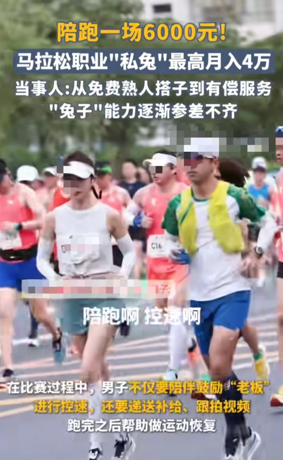最近,一则关于马拉松“私兔”的新闻在跑圈刷屏——有人靠陪跑服务月收入轻松突破4万元,单场收费甚至高达6000元!