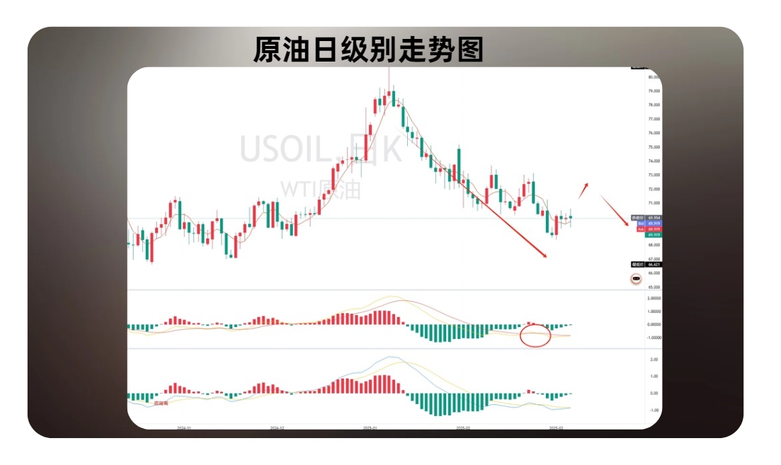 Macd已经有金叉融合的现象,且出现底背离现象后续原油大概率会出现上涨现象,等待后续调整。