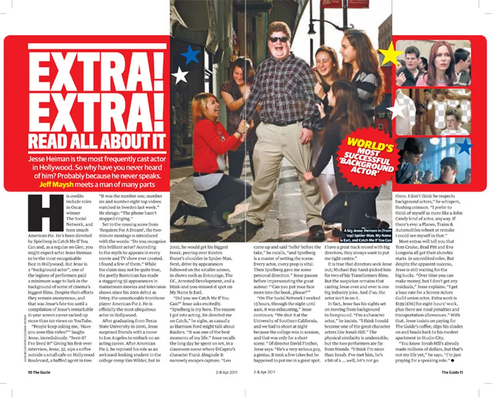 你或许没听过杰西·海曼这个名字,但你的眼睛肯定在他的电影里打过滚。这位哥们儿可是好莱坞的“背景之王”,出演了200多部影视剧,却依旧保持着“神秘”的身份。每个女演员都想和他来一场银幕之吻,他甚至被雇去和李奥纳多的前任亲热,他就是那个被称为“世界上最伟大的临时演员”的家伙。