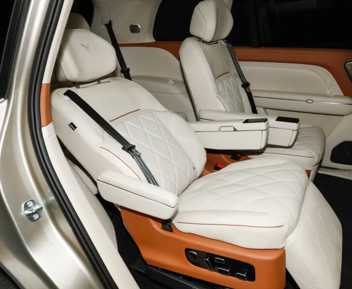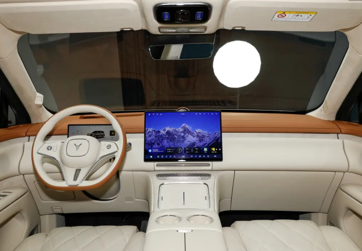 来到内饰,打开车门第一眼感觉显得前排空间特别大,视觉上带来的档次感非常高,特别是车门和座椅都采用这种千鸟格的缝线工艺,纳帕真皮摸起来很柔软,座椅也有打孔的工艺,不仅带有通风加热和按摩功能,副驾驶也配有腿托功能。车内科技感感显而易见,配备10.25英寸液晶仪表板、55英寸AR抬头显示和16.1英寸中控屏幕,三屏结合为内饰提升科技氛围。车机还是鸿蒙的系统所以支持HUAWEI HiCar,进一步增强车机的可玩性。而且它后排配有隐藏玻璃,前后排都用多层隔音玻璃,车门一关几乎就是零噪音了。