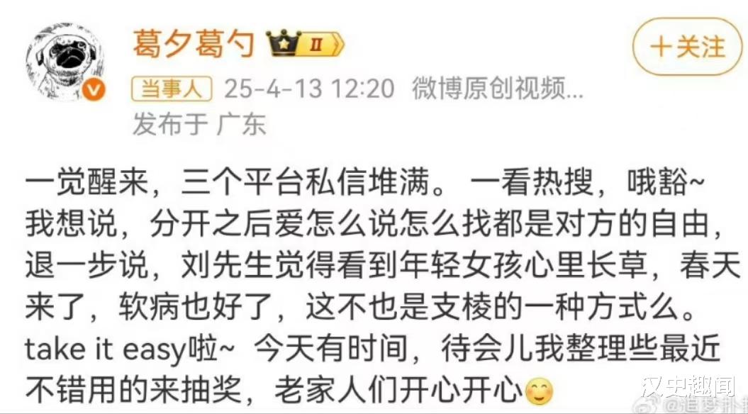 4月13日,葛夕和前夫留几手双双上了热搜。原来留几手在直播时说他离婚后,不排斥女性了,也敢和异性说话,攀谈了。