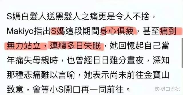 大S生前好友Makiyo透露,黄春梅(S妈)痛到无力站立,连续多日失眠,她回忆起当年痛失母亲时,也曾经日日难分昼夜。