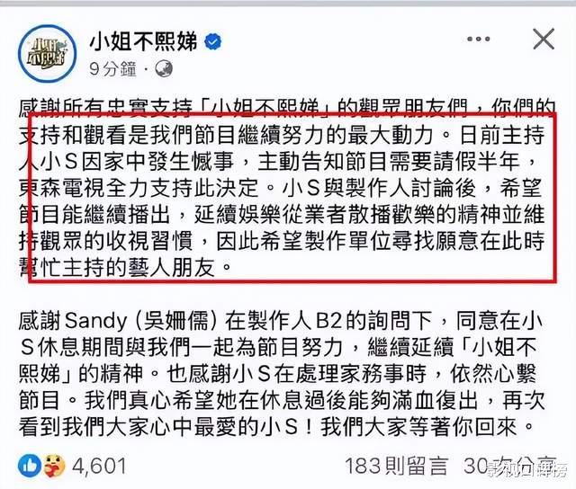 与大S感情深厚的妹妹小S,主动向节目组请假半年。