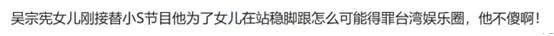有网友则认为,吴宗宪不傻啊!自己的女儿正在代班主持小S之前主持的节目《小姐不熙娣》,而且反响不错。