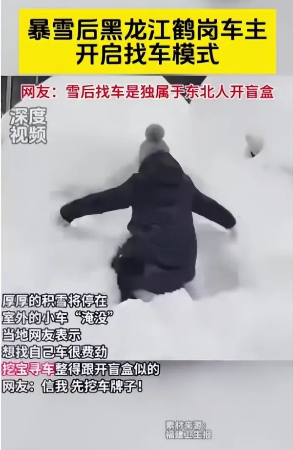 在被大雪覆盖的场景中,汽车仿佛变成了雪堆里的“雪馒头”,而雪后寻找车辆已经变成了当地居民的一种新乐趣,分享寻找车辆的技巧也成了一种流行:“听我说,首先得把车牌挖出来。”