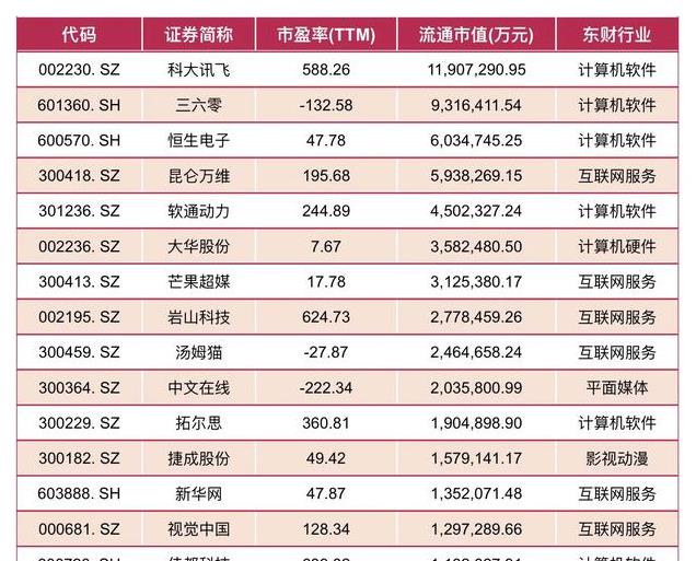 科大讯飞(计算机软件巨头)、三六零(计算机软件老牌)、恒生电子(计算机软件重要)、昆仑万维(互联网服务关键)、芒果超媒(互联网服务先锋)、汤姆猫(互联网服务知名)、中文在线(平面媒体关键)、拓尔思(计算机软件骨干)、捷成股份(影视动漫关键)、新华网(互联网服务重要)、视觉中国(视觉内容关键)、佳都科技(计算机软件知名)。