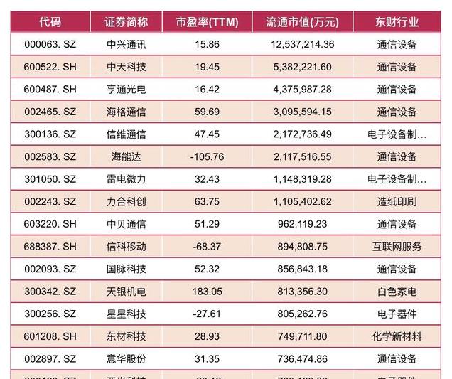 中兴通讯(通信设备巨擘)、中天科技(通信设备先锋)、亨通光电(通信设备骨干)、海格通信(通信设备知名)、信维通信(电子制造先进)、海能达(通信设备有地位)、雷电微力(电子制造新秀)、力合科创(造纸印刷领先)、中贝通信(通信设备主力)、信科移动(互联网服务新秀)、国脉科技(通信设备老牌)、天银机电(白色家电关键)、星星科技(电子器件重要)、东材科技(化学新材料骨干)、意华股份(通信设备知名)、亚光科技(电子器件有地位)