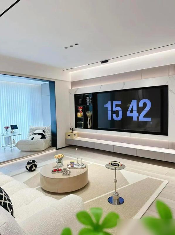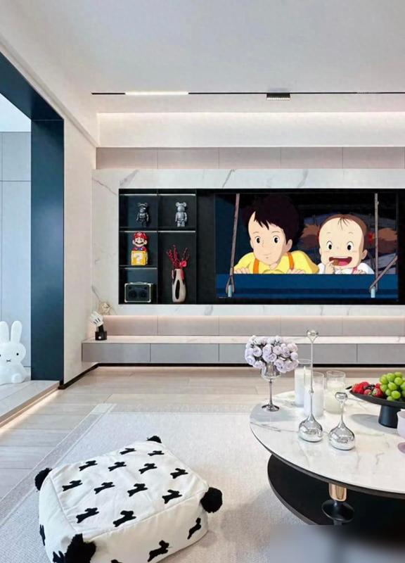 无主灯设计让天花板干干净净,磁吸轨道灯搭配灯带,光线像会跳舞似的,岩板电视墙泛着温润的光。