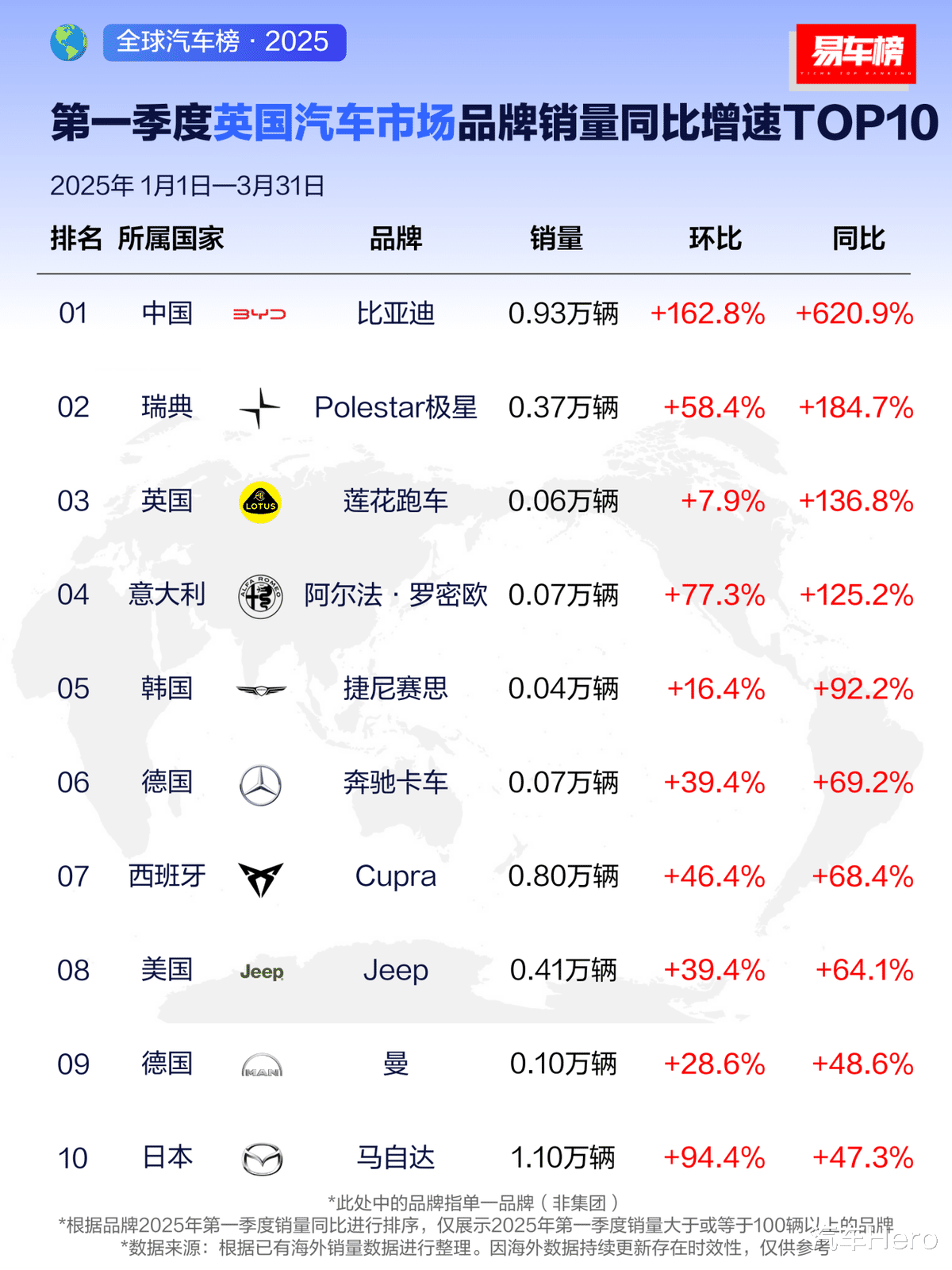 在英国市场,比亚迪宋Plus DM-i搭载了第五代DM技术,3月份摘得插电式混合动力汽车销量冠军,一季度销量达到0.93万辆,同比增长620%,并在12个核心城市完成了门店布局。