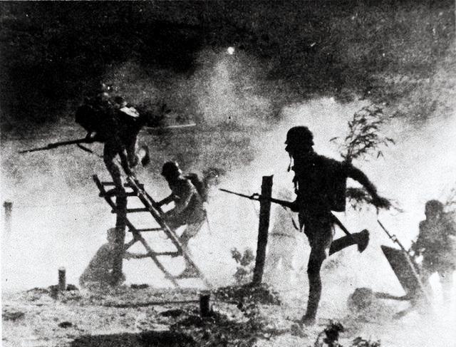 起初只是剧烈的枪响,紧接着传来“轰”的巨响,那是手榴弹一颗一颗爆炸的声音,行军前排的人一边交战一边掩护战友往后撤退。一时间战火四起,硝烟弥漫。
