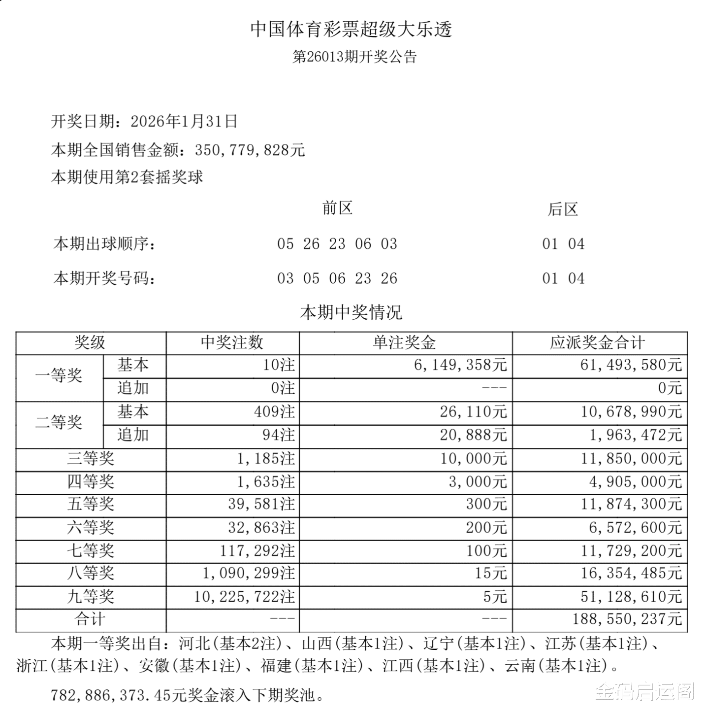 体彩超级大乐透第26013期开奖。本期全国销量高达3.5亿元。开奖号码为:前区 03、05、06、23、26,后区 01、04。一组看似平常的组合,却蕴藏着微妙的关系,为全国彩民送上了10注丰厚头奖。