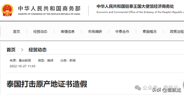 另外,更早之前,中国商务部还曾就“泰国打击原产地证书造假”一事发出紧急通知。
