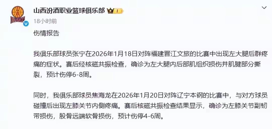 1月20日山西对阵辽宁的比赛,焦海龙与鄢手骐发生碰撞,赛后经“核磁共振检查,确诊为左膝关节副韧带损伤,股骨远端软骨损伤,预计伤停4~6周,俱乐部同时官宣确认了这个消息。