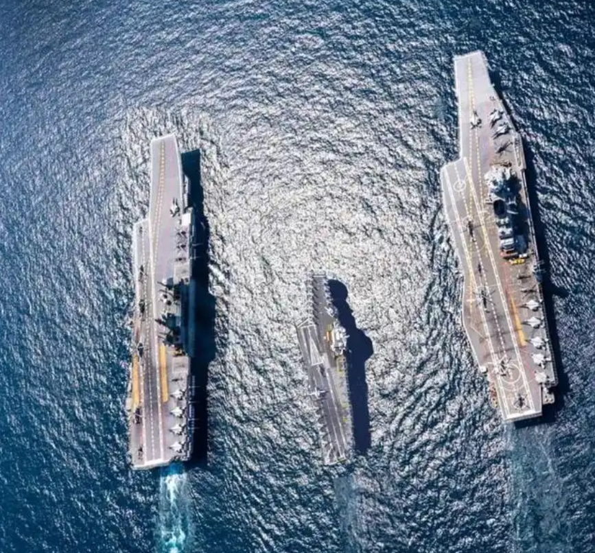 军演首日,印度媒体发布了一张“三航母同框”的震撼照片:两艘印度航母威武霸占C位,而法国的戴高乐号竟被P得只有自家航母的四分之一大小,活脱脱像一艘“遥控玩具船”漂在中间!更离谱的是,印度人还把根本没参演的“维克拉玛蒂亚号”硬塞进画面,凑成“三航母全家福”。连戴高乐号上的舰载机“阵风M”都被缩水成米格-29K的一半大小,网友笑称:“印度P图技术,航母见了都自闭!”