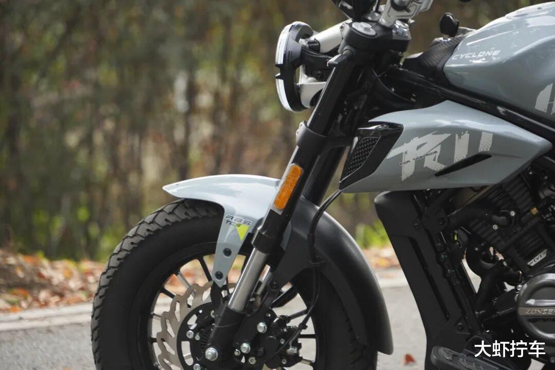 朋克190的前减震配备了一套37mm叉芯的倒置减震器,后悬挂是钢管焊接复合摇臂搭配内置气囊的直连中置单后减震结构,轮组为铝合金压铸的前后15寸轮毂搭配一对规格为前120/90-15后140/80-15的诚远轮胎,由于较厚的胎壁规格和舒适化的原厂减震器设定,朋克190对路感细碎颠簸的过滤是在正常水准以上的.