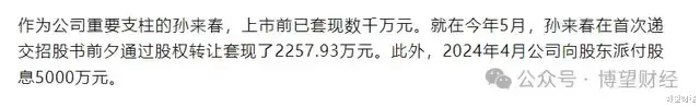 据《山东商报》报道,创始人孙来春在上市前已套现数千万元。今年5月,孙来春在首次递交招股书前夕通过股权转让套现了2257.93万元。