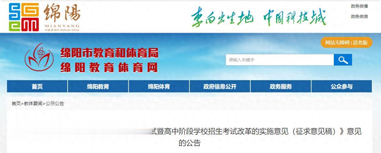 近日,绵阳市教体局发布了关于公开征求《关于深化初中学业水平考试暨高中阶段学校招生考试改革的实施意见(征求意见稿)》意见的公告。