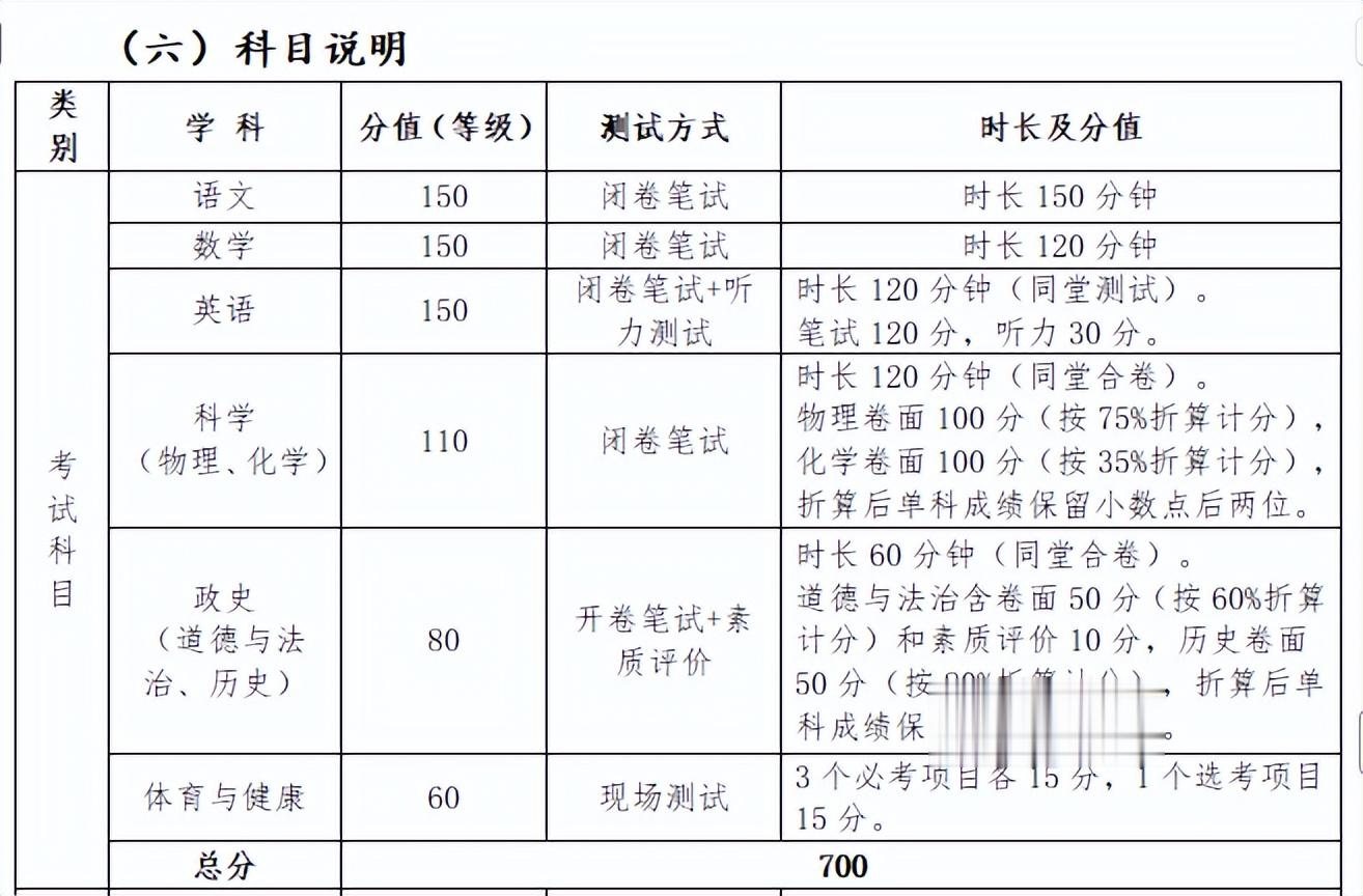 根据公告内容,中考满分为700分,各考试科目的分值分别为:语文、数学和英语均为150分;科学(物理、化学)为110分,其中物理卷面100分(按75%折算计分)、化学卷面100分(按35%折算计分);政史(道德与法治、历史)为80分,其中道德与法治含卷面50分(按60%折算计分)和素质评价,历史卷面50分(按80%折算计分);体育与健康为60分。