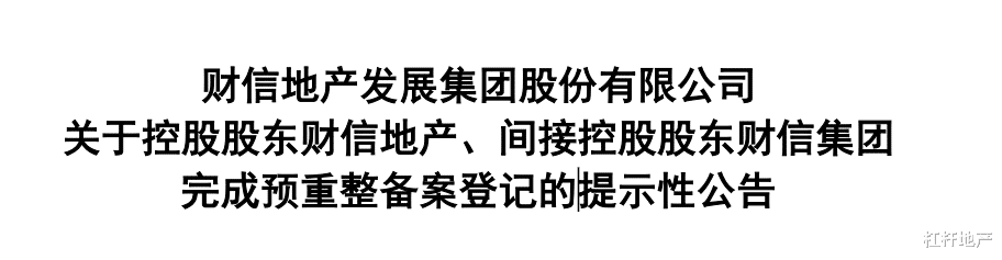 财信发展刚刚披露,控股股东财信地产、间接控股股东财信集团完成预重整备案登记。