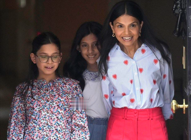 阿克沙塔是印度白富美,年龄比老公相仿,一身撞色打扮身材不错,就是脸太显老啦;苏纳克搂着大女儿,手里拿着电影票,手腕上的红绳抢镜;大女儿穿着裙子,精致五官遗传爸爸,小女儿穿着T恤牛仔裤,颜值随了妈妈。