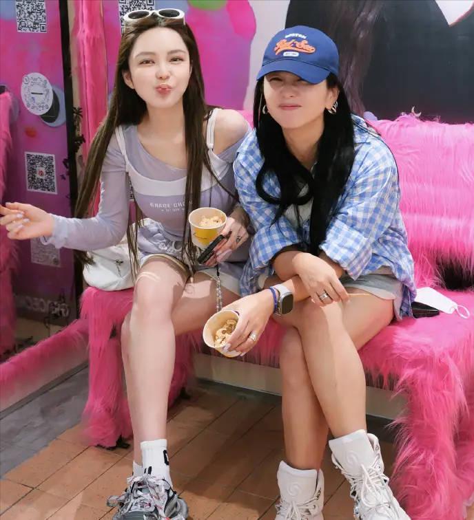 可以一起吃冰淇淋,一起逛街,心血来潮时还一起站在大玩偶前合拍了不少照片,两人都是穿着超短裤秀着美腿,一看就毫无芥蒂,心情很放松。
