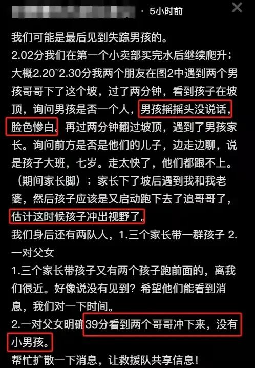 说到线索,目击者的描述更让人心焦。有游客看到孩子站在石头上时,父母就在不远处喊他“慢点走”,可转眼间人就不见了。另一位游客却称只看到孩子的两个哥哥,没见到男孩本人。这时间差和视角矛盾,让网友忍不住嘀咕:“父母是不是隐瞒了什么?”但说句实在话,现在追究责任不如先找人。毕竟孩子失踪时脸色惨白、体力不支,大概率还在山上某个角落。
