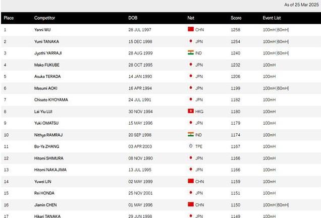 四月初,世界田联的积分榜悄悄刷新,吴艳妮的名字又一次顶在了亚洲亚洲女子100米栏的第一行——只比日本选手田中佑美多了4分。