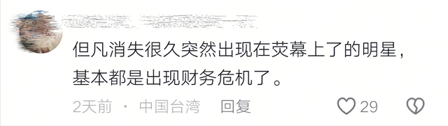但凡消失很久突然出现在荧幕上的明星,基本都是出现财政危机了。