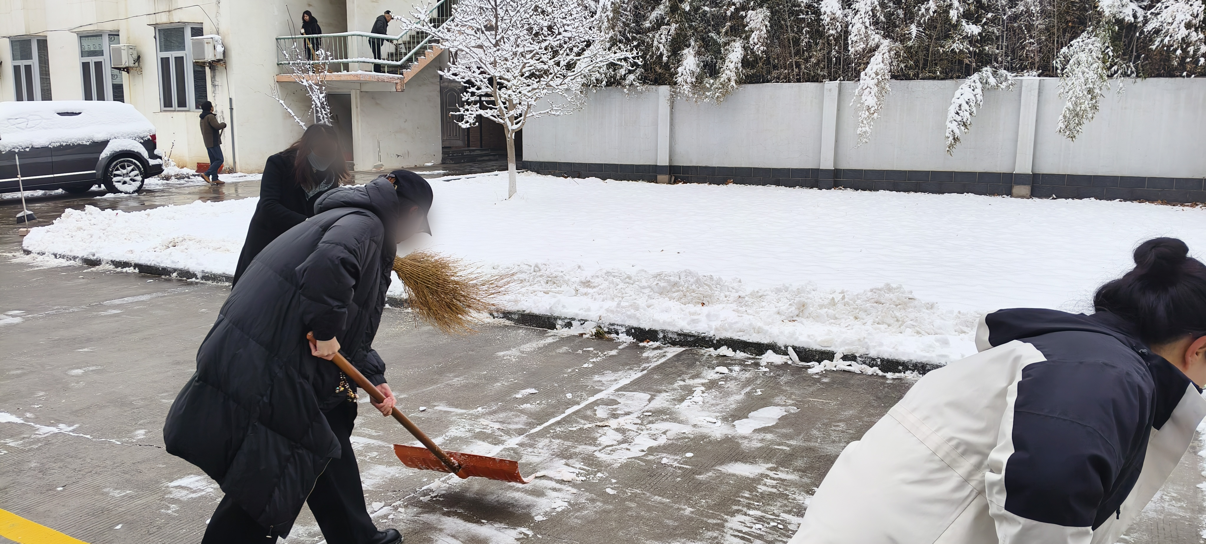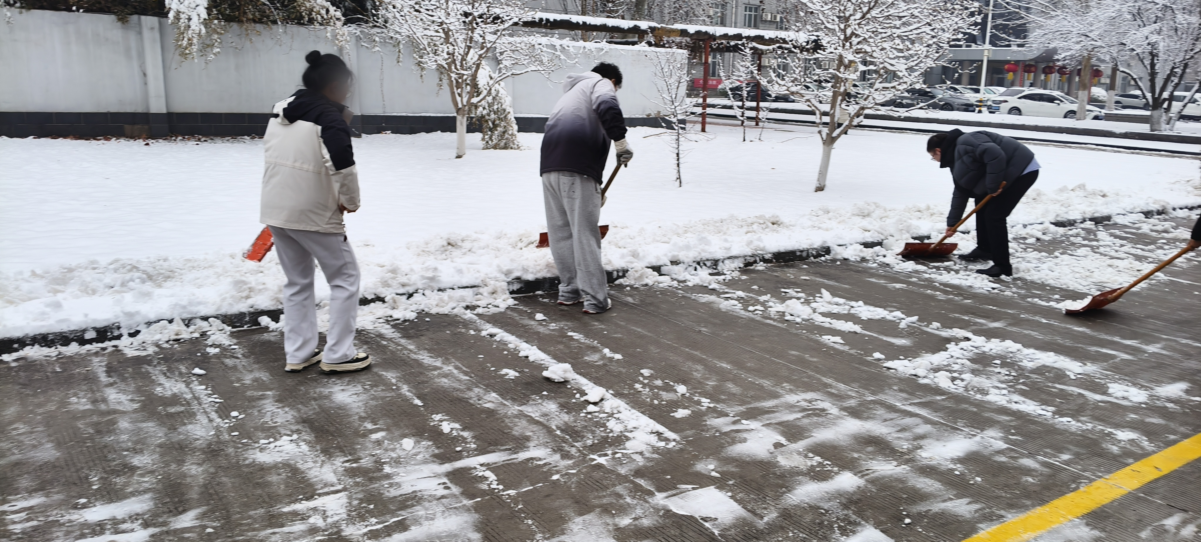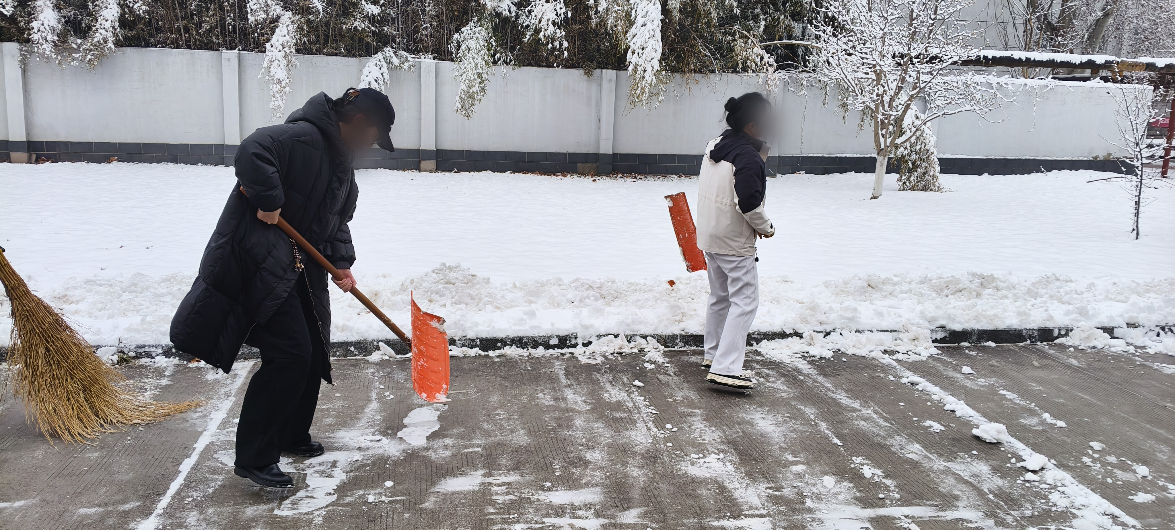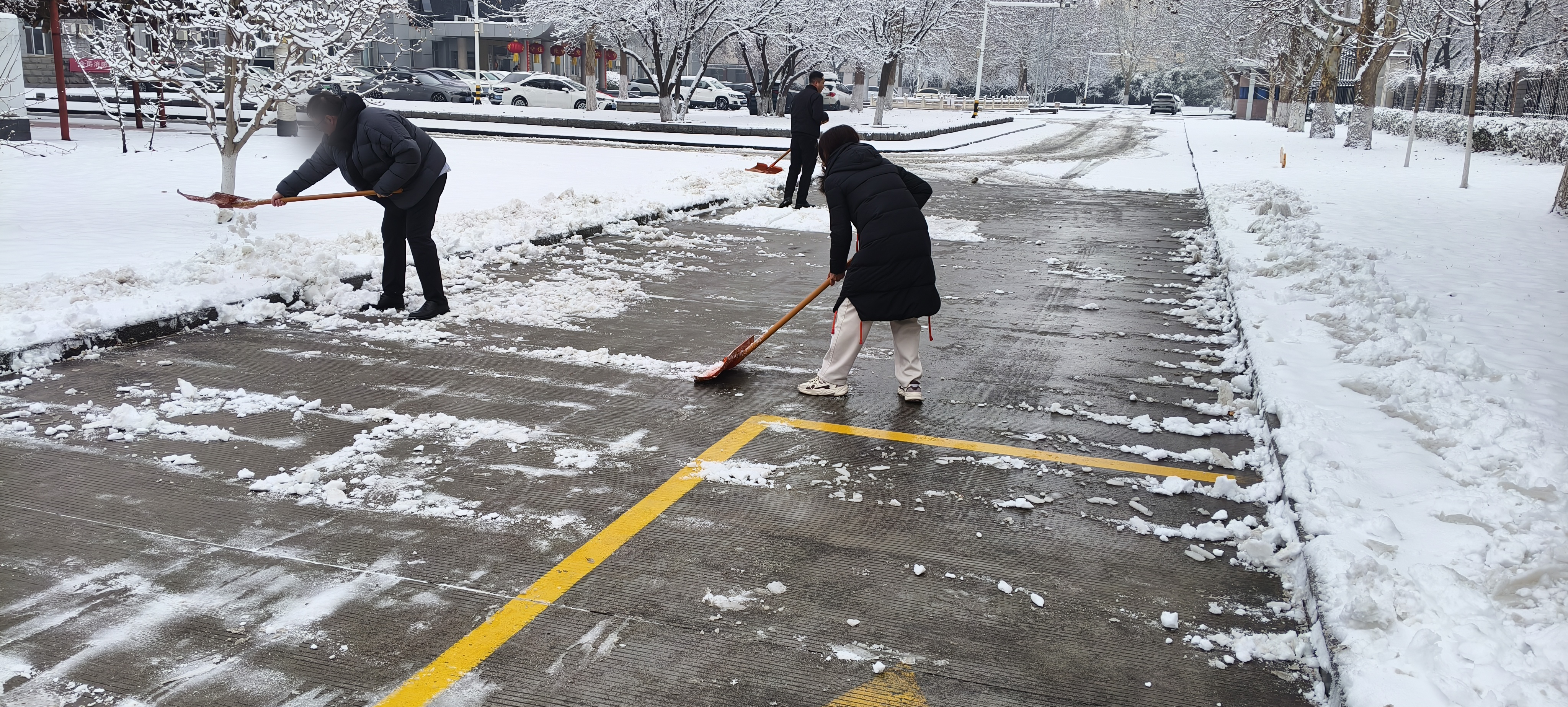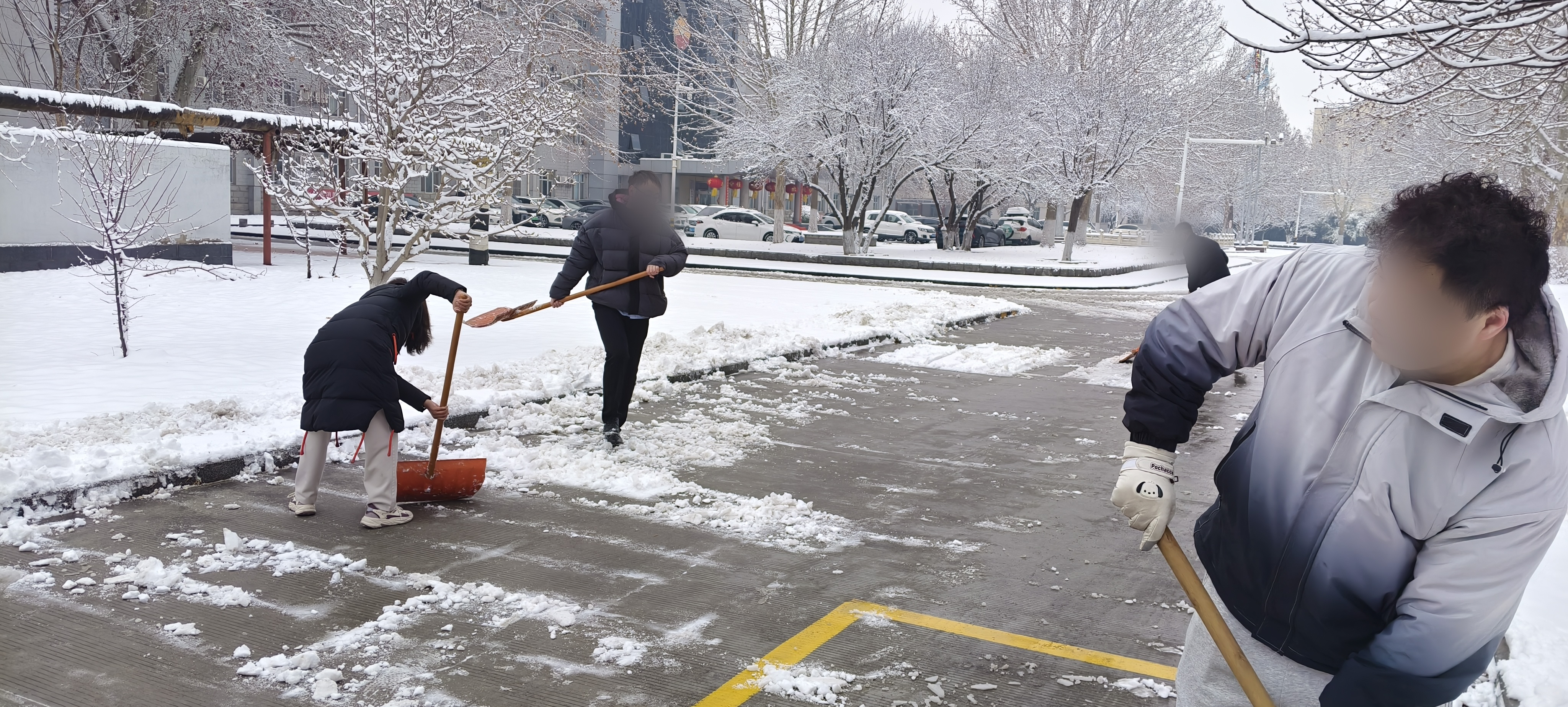 一大早,大家就带着铁锹、扫帚、推雪板等工具来到办公楼下,虽然天气寒冷、寒风阵阵,但大家干劲十足。现场分工明确,有人负责铲雪破冰,有人负责清扫堆积,有人把积雪推到路边,配合得十分默契。大家不畏严寒、齐心协力,重点清理主干道、出入口等关键路段,不放过边角死角,全力把积雪和薄冰清理干净。