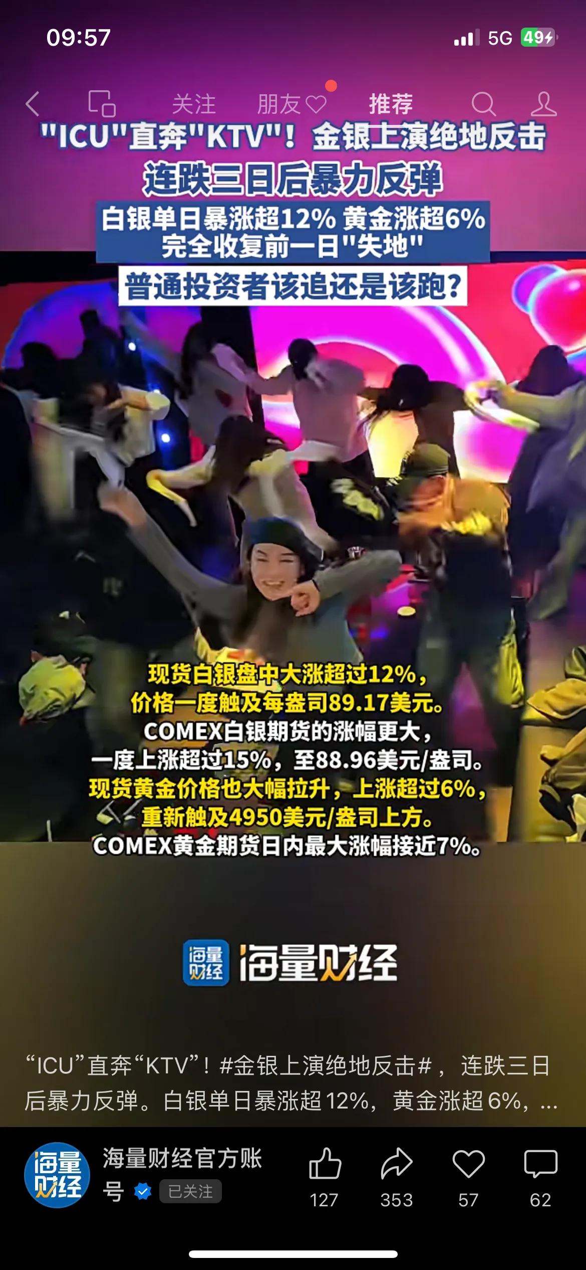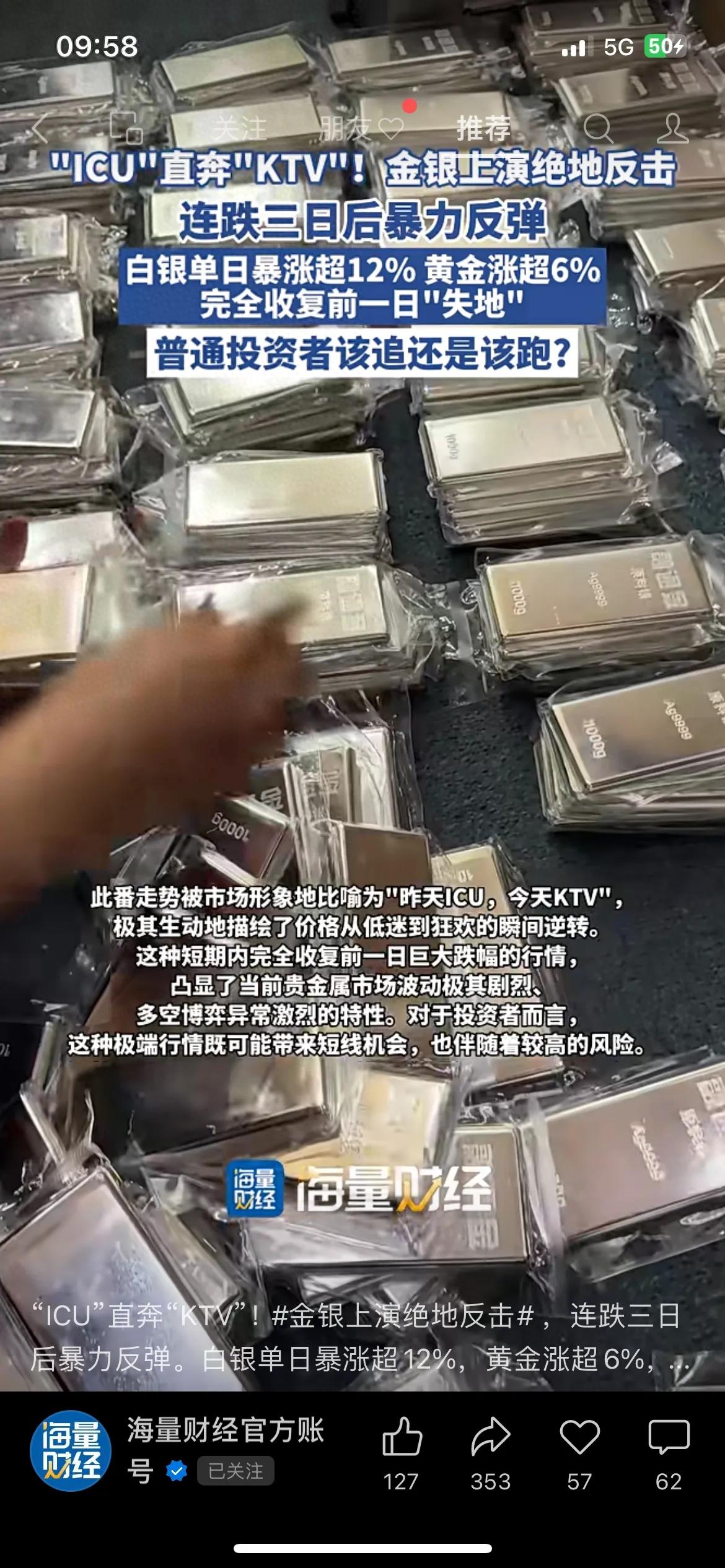我闺蜜上周刚割了白银ETF,今天就拍大腿——白银单日暴涨12%,黄金涨超6%,刚经历“史诗级暴跌”的金银,直接从ICU蹦去了KTV。