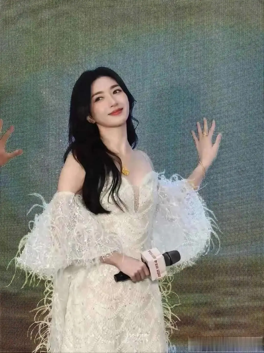 绣花长裙:上台领奖时换上低胸绣花长裙,半透明蕾丝与花朵点缀,宛如一幅工笔画,尽显温婉与高级感。
