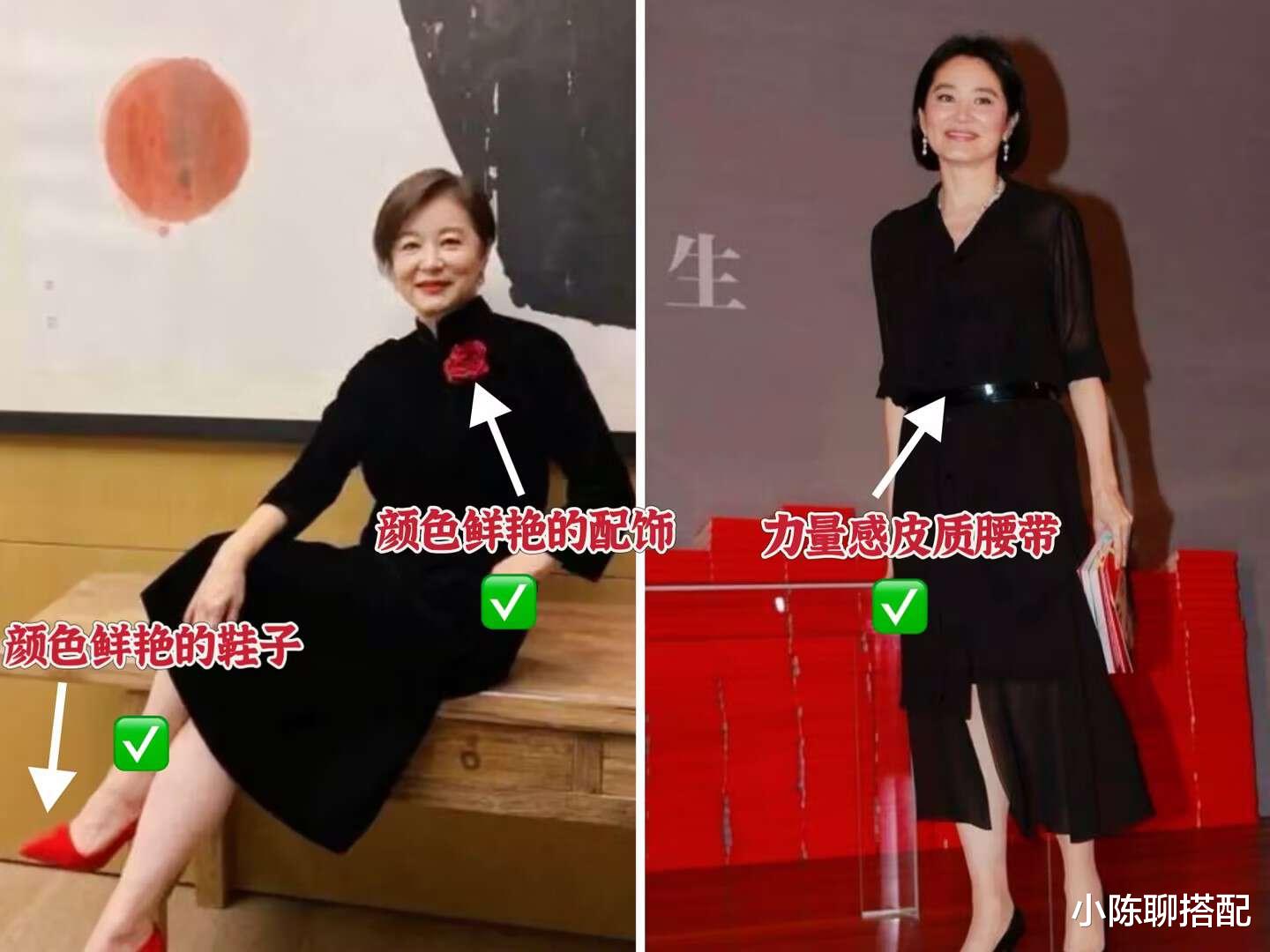 也可以是同色系的,就像林青霞穿着黑色雪纺面料的裙装,太过轻飘的面料易给人小家子气的感觉,这个时候就适合加入具有力量感的皮质腰带,瞬间就会变得大气上档次了。