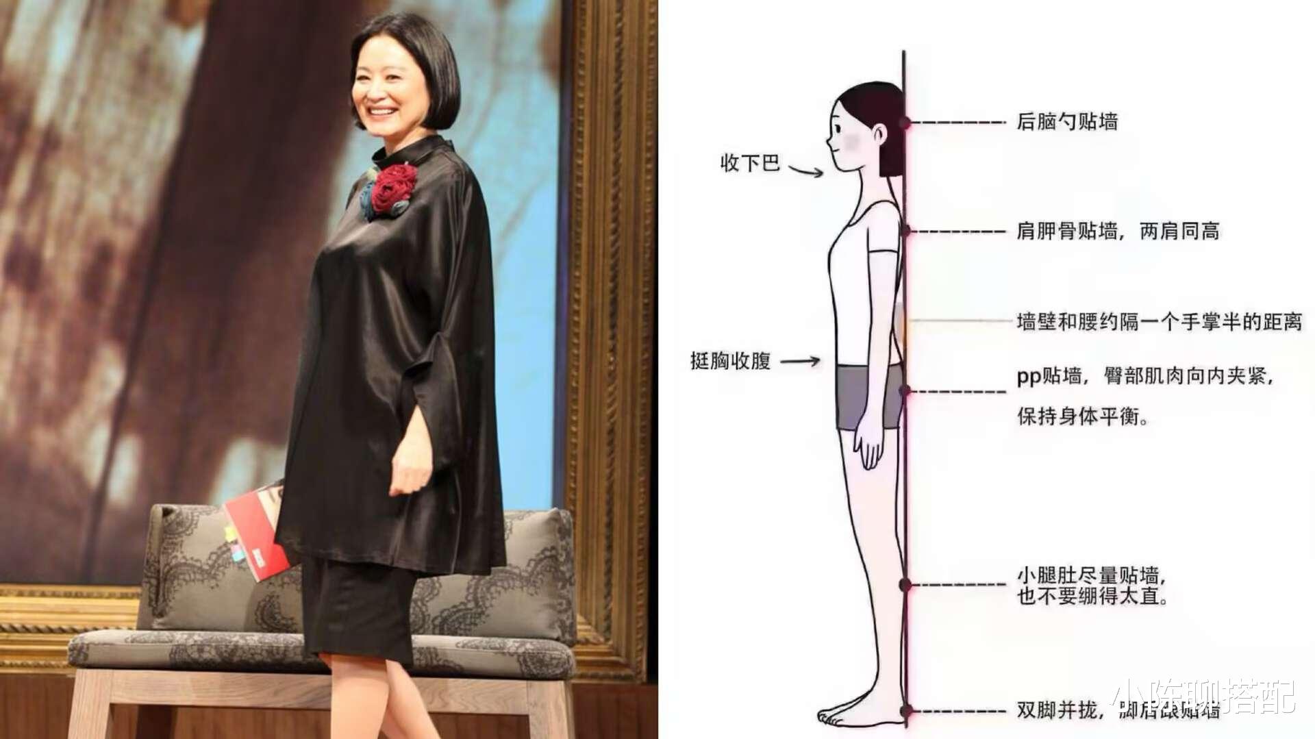 就如同林青霞一样,她的身材不属于纤细型的,但依然能够保证自己有着挺拔身姿,双肩自然的打开,双手自然下垂,挺直了腰板,很难让人相信这是一个70岁老年人的站姿。