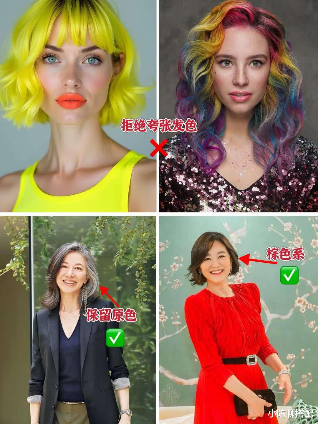 年长的女性,千万不要为了一时的新鲜感去尝试夸张发色,太过时髦个性反倒会有悖于自身气质,也会损伤其发质。