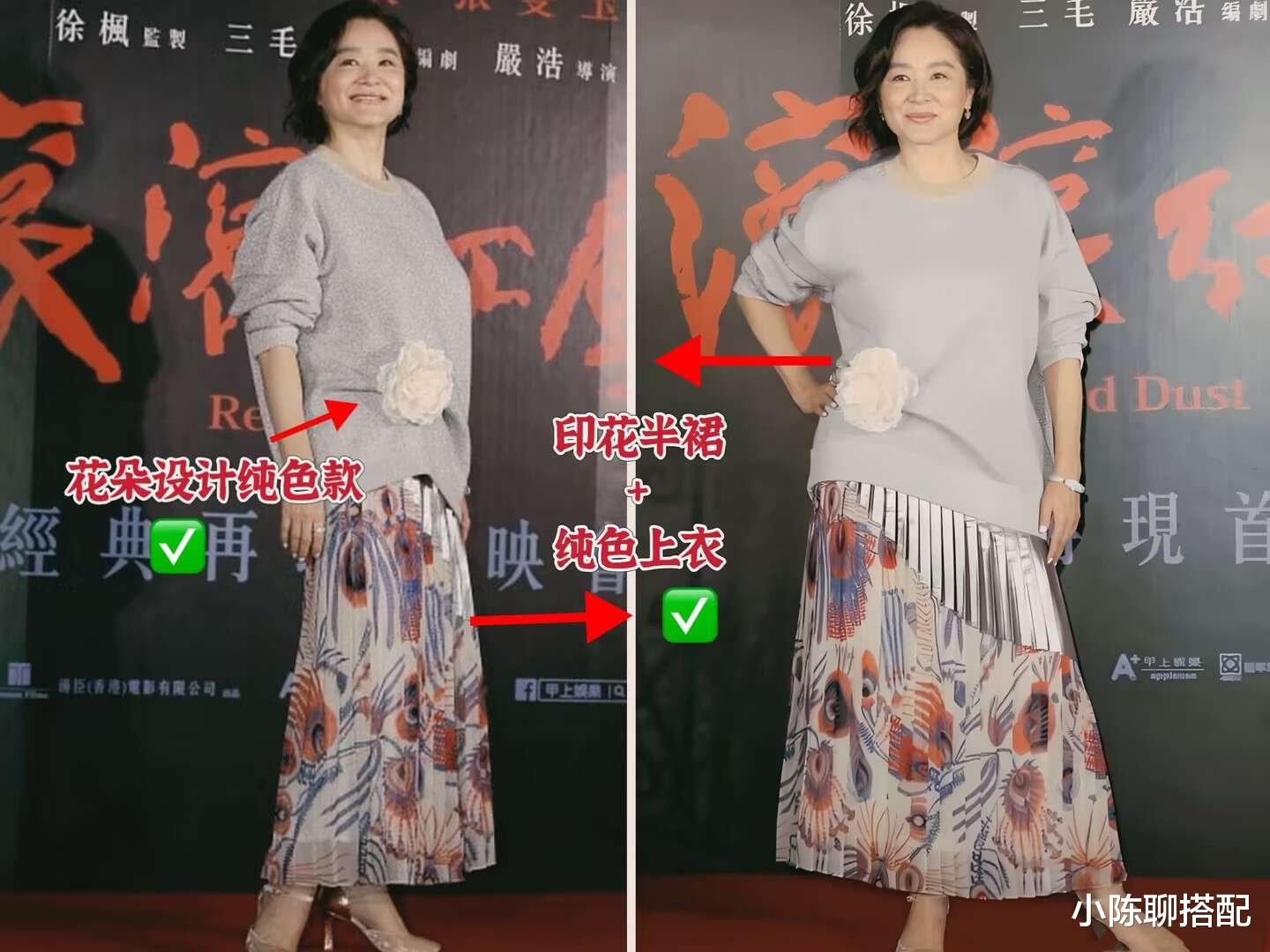 而为了达到一个很好的视觉平衡作用,可以像林青霞一样,在穿着印花半裙时,上衣选择纯色款,可以戴上一个花朵设计的纯色胸针,这样整身穿搭造型感也有了,还能带给人一种干净又清爽的感觉。