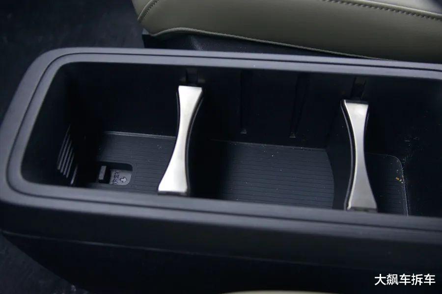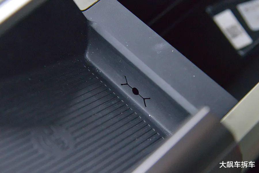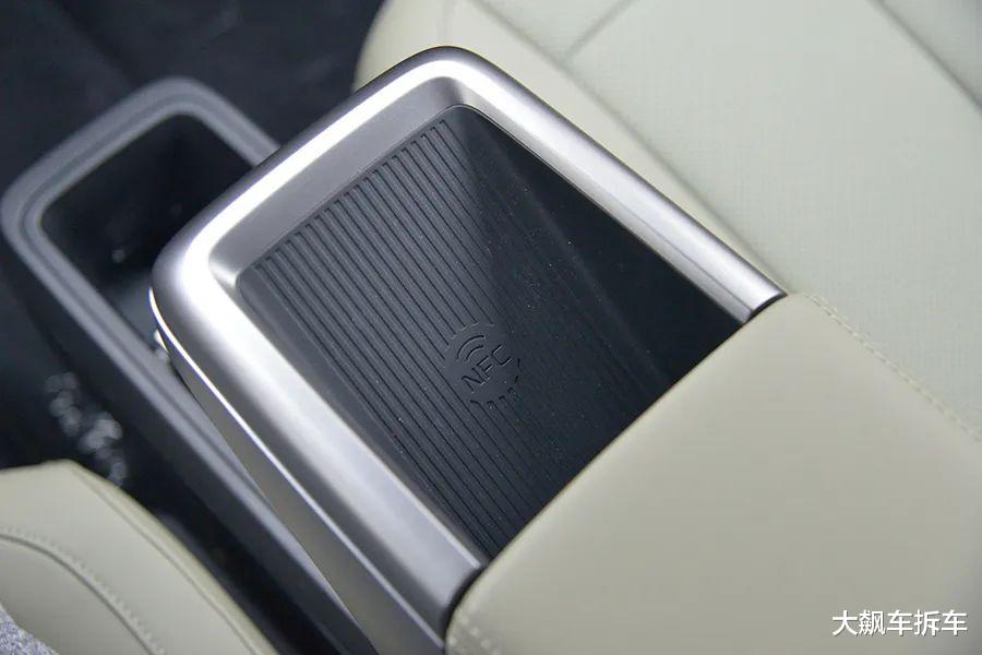 前排扶手箱有一个放手机的位置,同时也是NFC解锁感应区,不支持手机无线充电,如果想充电,可以通过后方小孔把充电线穿过来。
