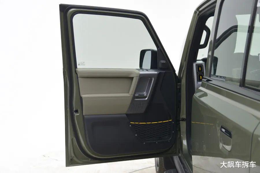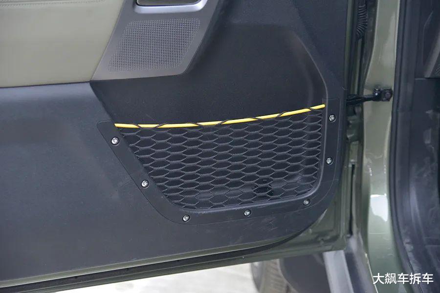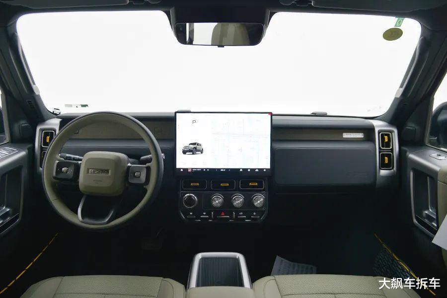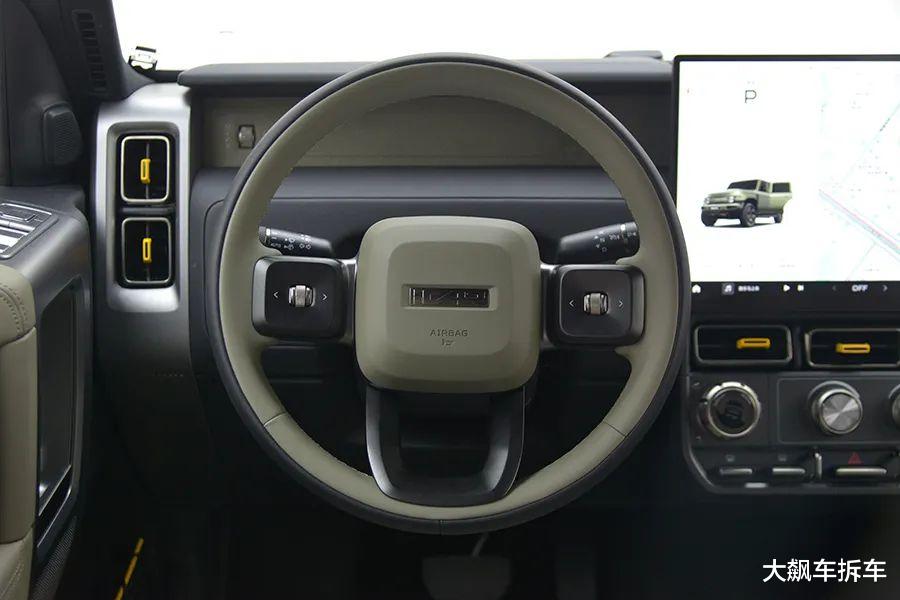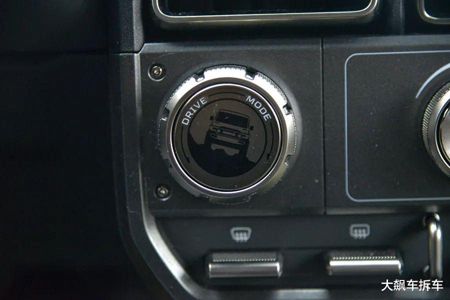 屏幕下方的旋钮非常有复古硬派越野的风格,左侧是驾驶模式选择,其余是空调和音响控制按键。