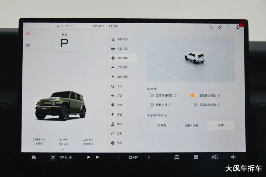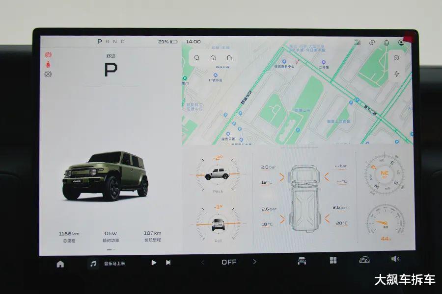 这辆车配有一块15.4英寸中控屏,搭载了一颗骁龙8155芯片,流畅度没有问题,屏幕支持显示多种越野数据,还支持PD连接线游戏主机投屏。
