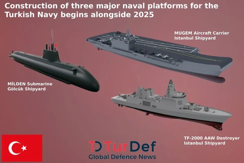 据defenceturk网站2025年1月3日报道,土耳其国防部在2025年第一次新闻发布会上宣布,土耳其国家潜艇(MILDEN)的首次焊接在格尔居克造船厂司令部完成,“TF-2000防空型驱逐舰”和“MUGEM国家航空母舰”的首次钢板切割仪式在伊斯坦布尔造船厂司令部进行。土耳其国防部长亚沙尔·居勒于2024年12月会见了安卡拉新闻和广播机构代表,解释了2024年开展的活动,宣称计划在2025年头几个月对国家航空母舰和TF-2000防空作战驱逐舰项目开展钣金切割活动,还宣布进行总共31艘船舶的建造活动。