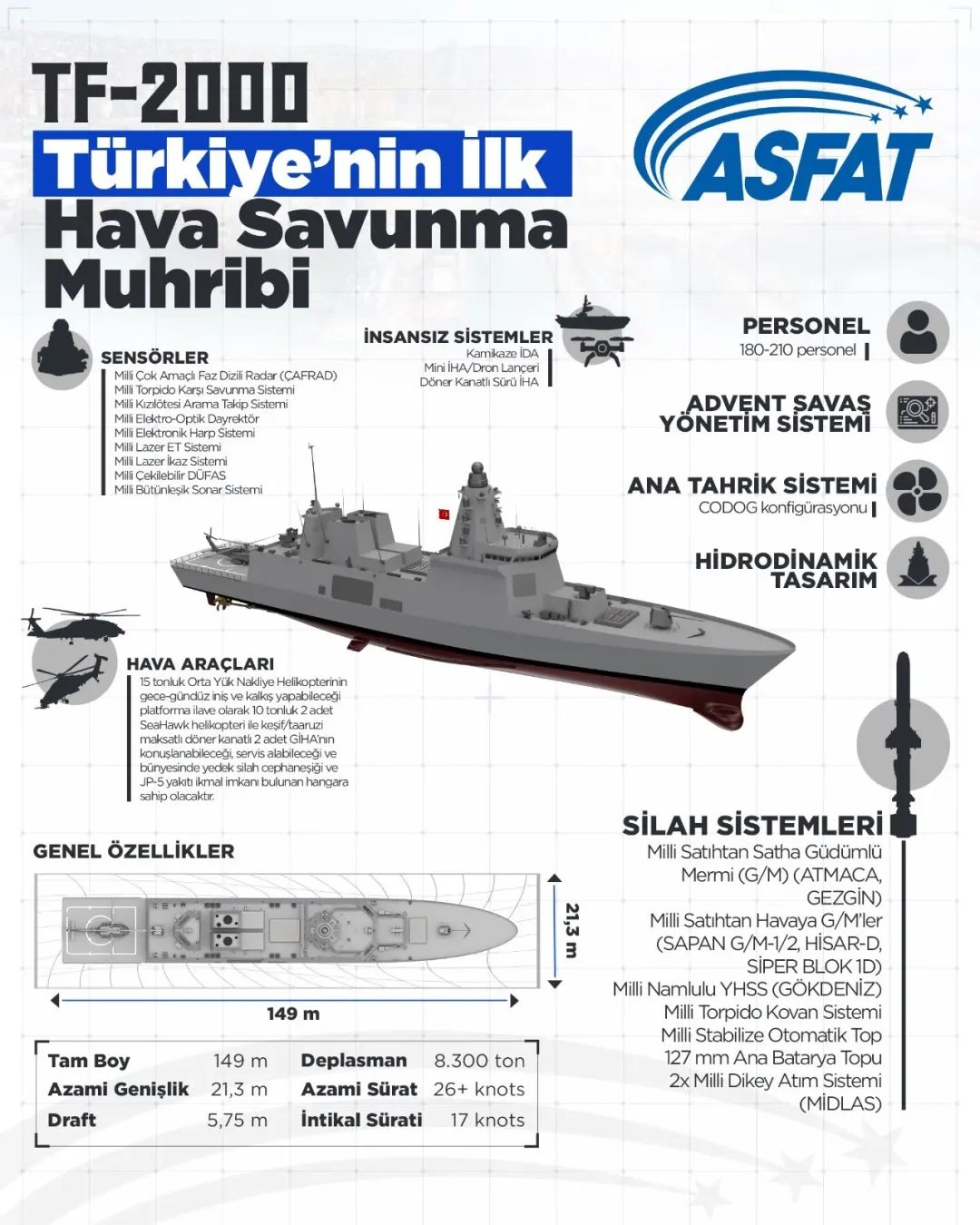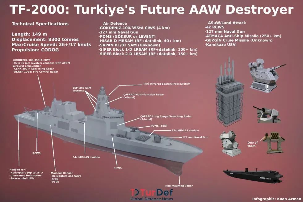 土耳其海军于2017年7月启动了TF-2000项目,以满足防空驱逐舰的需求。TF-2000防空驱逐舰由伊斯坦布尔海军造船厂开始建造。该舰长149米,宽21.3米,吃水5.75米,排水量8300吨。由柴油或汽油组合(CODOG)推进系统提供动力,预计最大速度将超过26节,巡航速度为17节,可容纳约180-210名人员。TF-2000将配备96个垂直发射系统(VLS)单元,能够部署多种地对空导弹,包括远程SIPER导弹。此外,它还将配备土耳其国产127毫米主炮、ATMACA反舰导弹、324毫米Aselsan的ORKA轻型鱼雷和先进的电子战系统,以及GEZGıN对地攻击导弹。近防武器还包括Aselsan25毫米STOP火炮以及位于船尾的35毫米Gokdeniz近程武器系统(CIWS),舰桥前部应该是Roketsan公司的LEVENT型RAM发射器,可容纳21枚近程防空导弹。