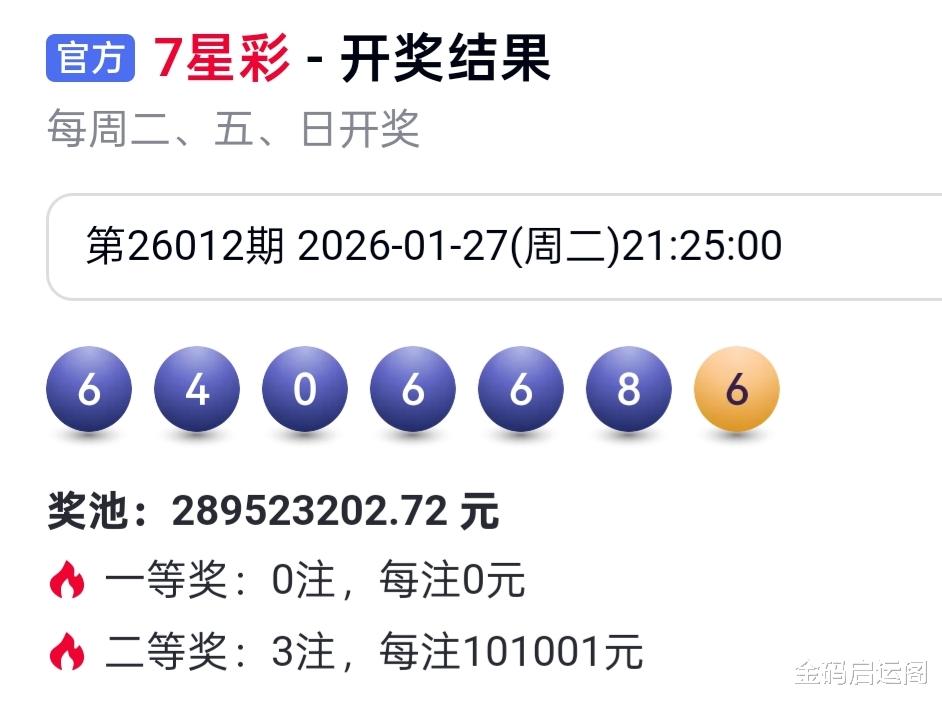 七星彩第26012期开奖结果刚刚出炉啦!开奖号码是:6、4、0、6、6、8,特别号码为6。