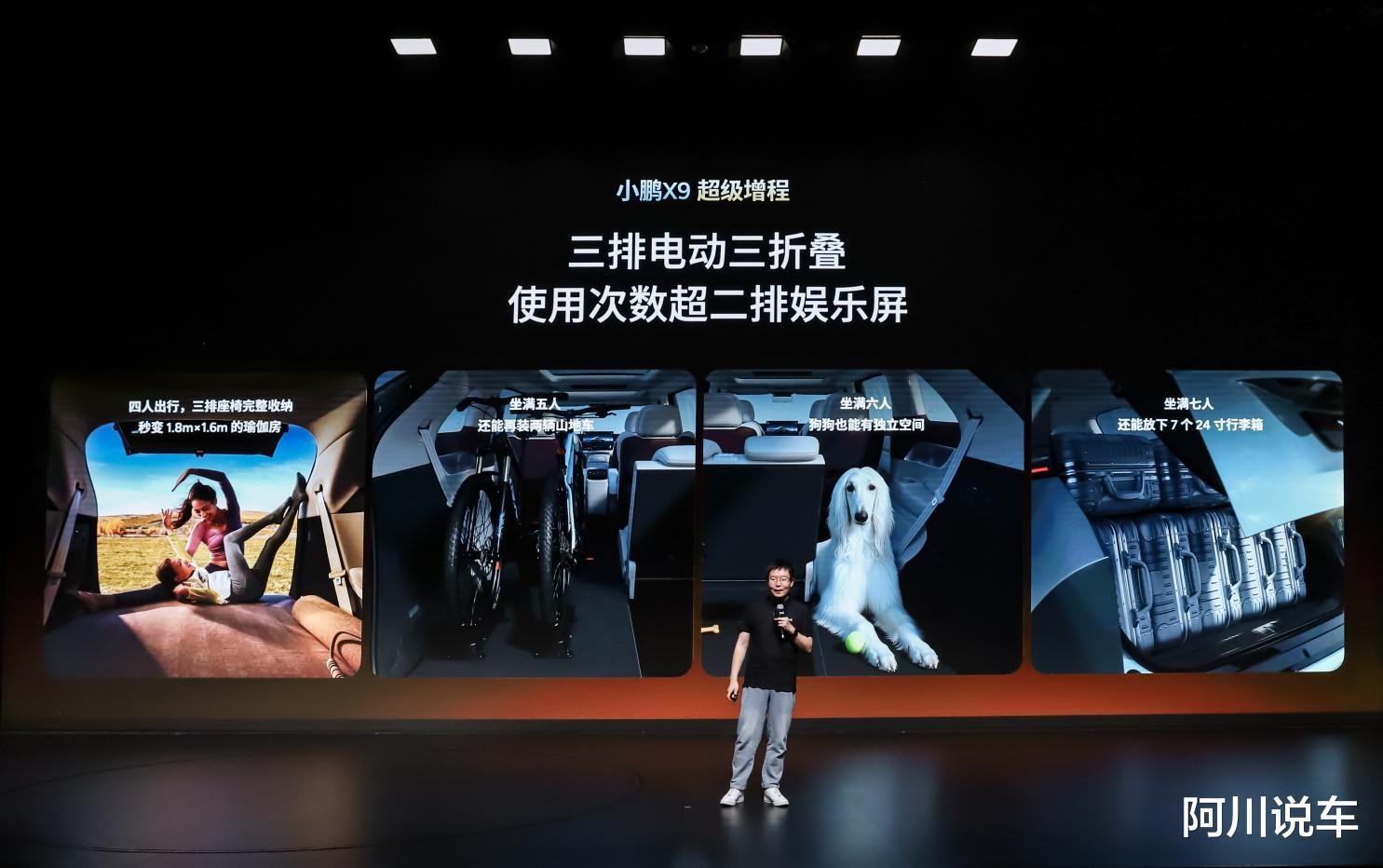 空间灵活性同样领先行业,小鹏 X9 超级增程满足用户丰富出行场景需求。全球首发的三排电动三折叠功能,随时化身可一键切换的“移动LOFT”。该车支持三排4/6分独立收纳,可无缝切换7座满员、6座带宠物、5座载自行车、4座露营大床房等多元模式,真正实现一车搞定通勤、带娃、社交、远行多种出行场景。