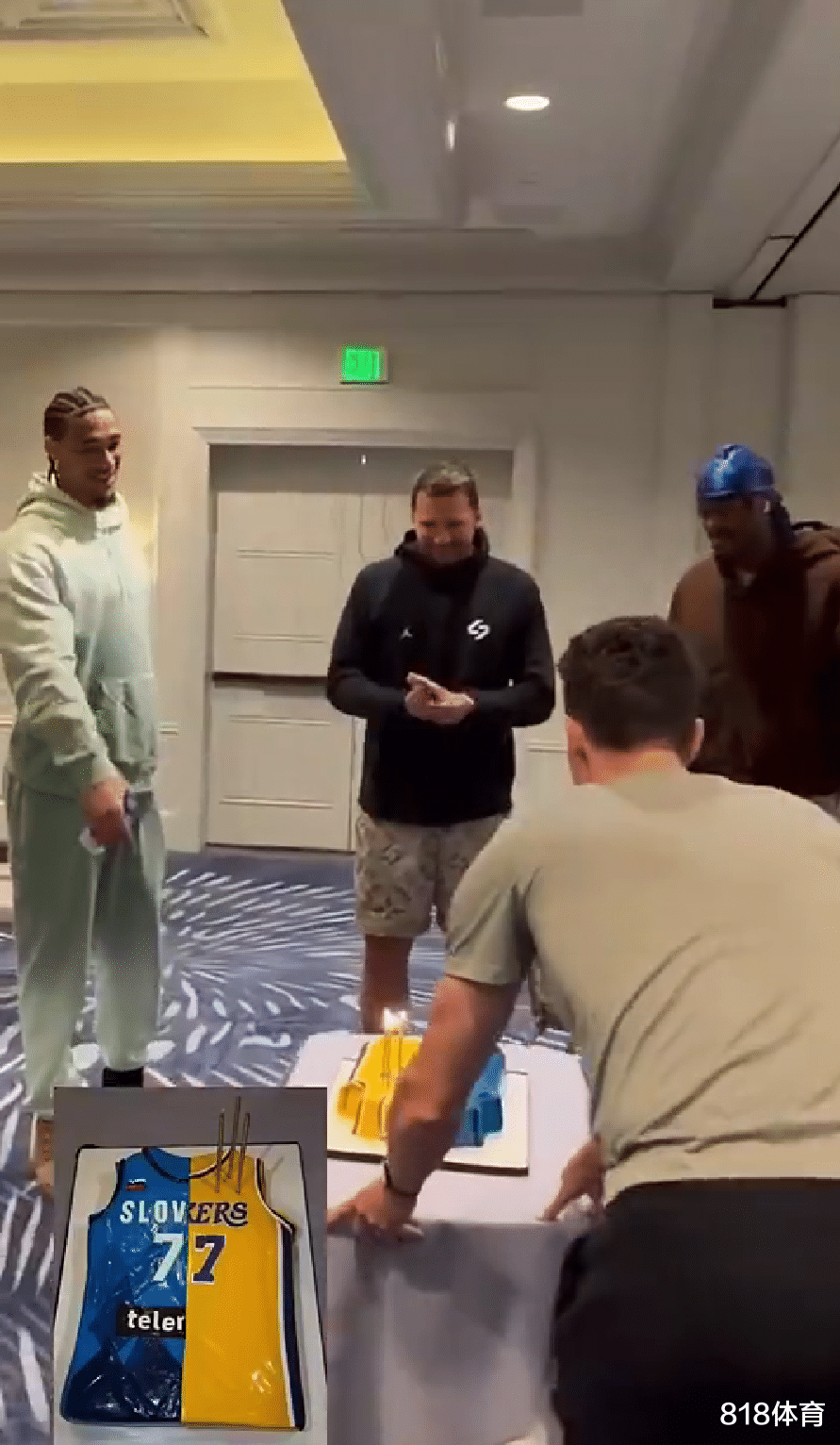 之后,湖人工作人员为东契奇送上了斯洛文尼亚国家队的球衣和湖人球衣拼接样式的蛋糕。
